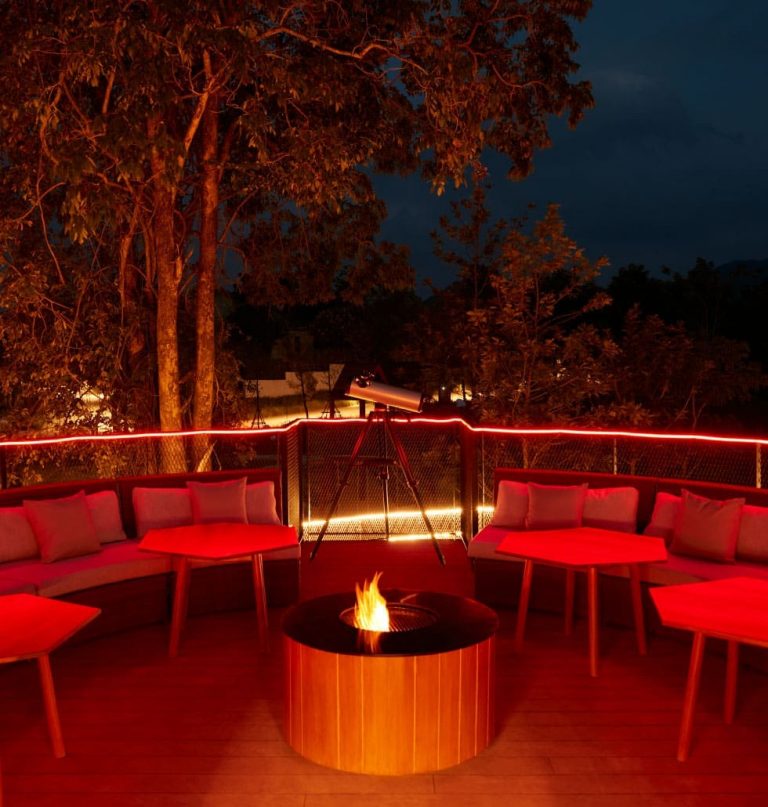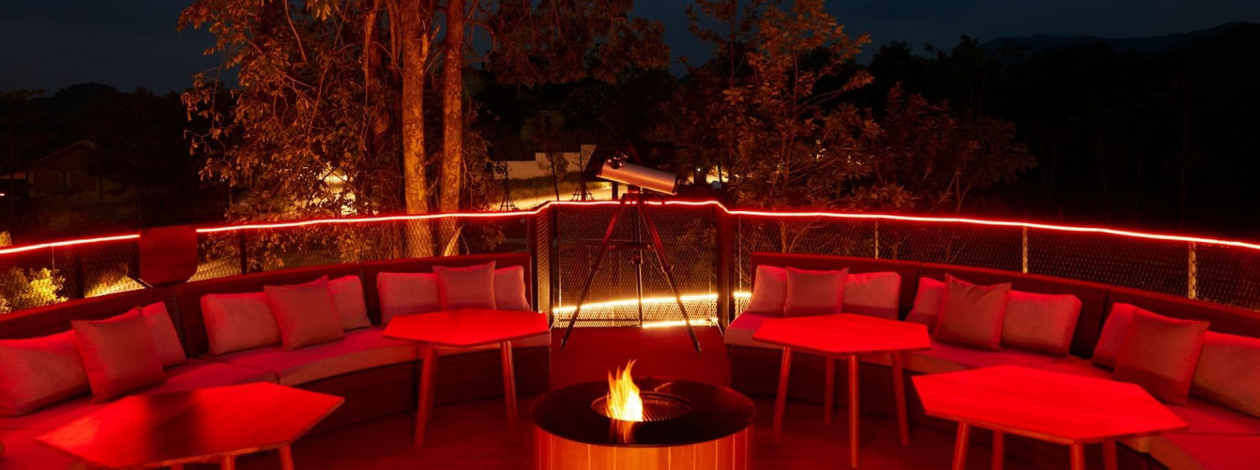Khao Yai offers urban guests rare visual access to the starlit night sky. Marasca Stardeck is an additional deck to the Tree Top tea house & farmer’s cafe, enabled with easy to use digital telescope. The cherry on the top experience is deep cherry red-lit floor deck, sharing bites, firepit ritual and drinks menu for ‘Sundowners to Stargazers’ featuring ingredients from our garden, including cosmic cocktails and tea mocktails to inspire stargazing.