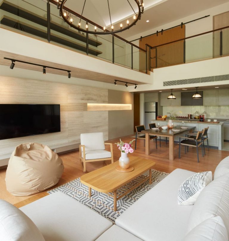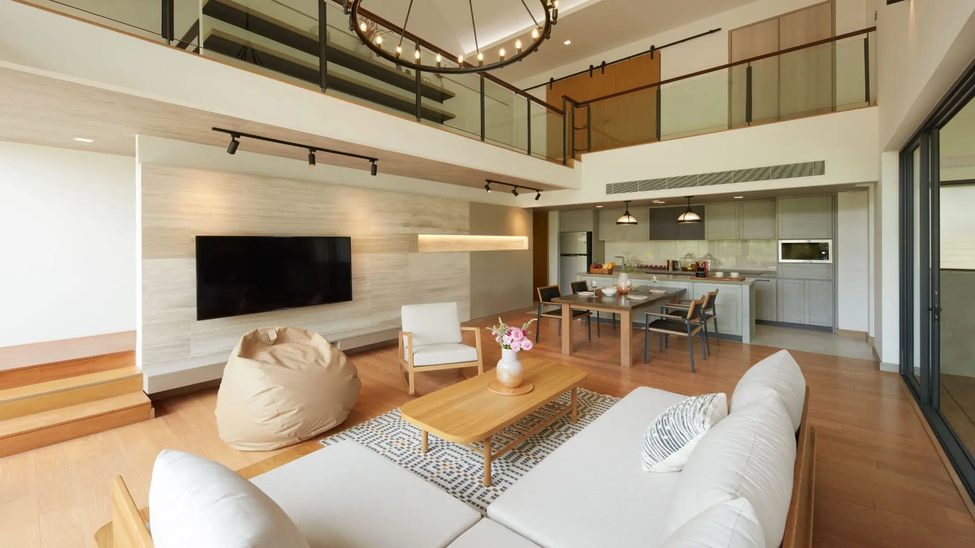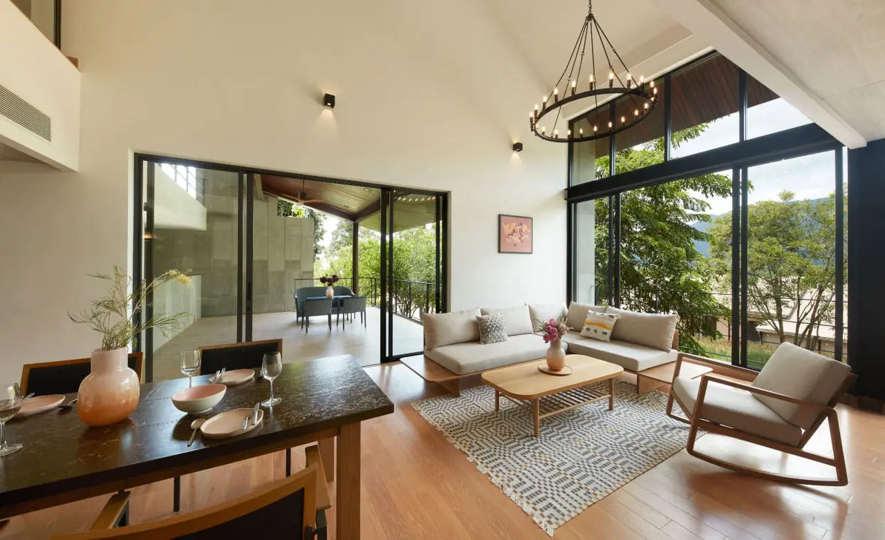 Overlooking the mountain range and greenery, the spacious living & dining area offers connection between indoor and outdoor areas. Terrace and your private firepit are ideal for nighttime stargazing.
